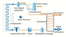Heat from the air is absorbed at low temperature into a fluid. This fluid then passes through a compressor where its temperature and pressure are increased, and transfers its higher temperature heat to the condenser and inlet cold water become outlet hot water through heat exchange. Then the fluid temperature and pressure are decreased by passing through throttling device. Then after going through the evaporator, the low temperature and pressure fluid turns from liquid to gas and enters into the compressor again. This cyclic phase change process can continuously heat the water in storage tank. The COP (Coefficient of performance) of this heating process is over 4.0.